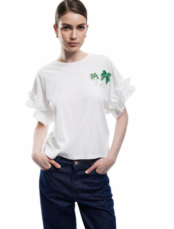 Pamuklu Boncuklu Palmiye Aplike Detaylı Bisiklet Yaka Kısa Kollu Fırfırlı Tişört Sepete Ekle