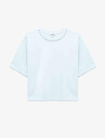 Kısa Kollu Bisiklet Yaka Pamuklu Taşlı Tişört Sepete Ekle