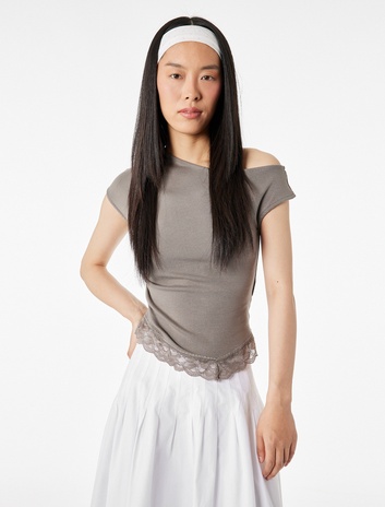 Dantel Detaylı Kısa Kollu Asimetrik Yaka Drapeli Omzu Açık Tişört