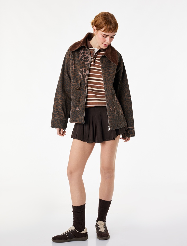 Kot Ceket Bisiklet Yaka Leopar Baskılı Düğmeli Cep Detaylı