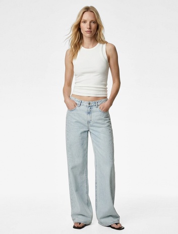 Pamuklu Düğmeli Cepli Geniş Paça Taşlı Denim Pantolon -  Wide Leg Jeans Sepete Ekle
