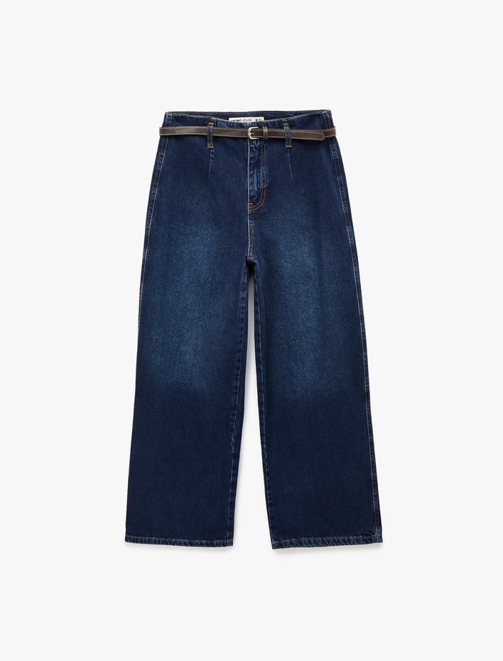 Pamuklu Yüksek Bel Kemerli Geniş Paça Denim Pantolon - Wide Leg Jean Sepete Ekle