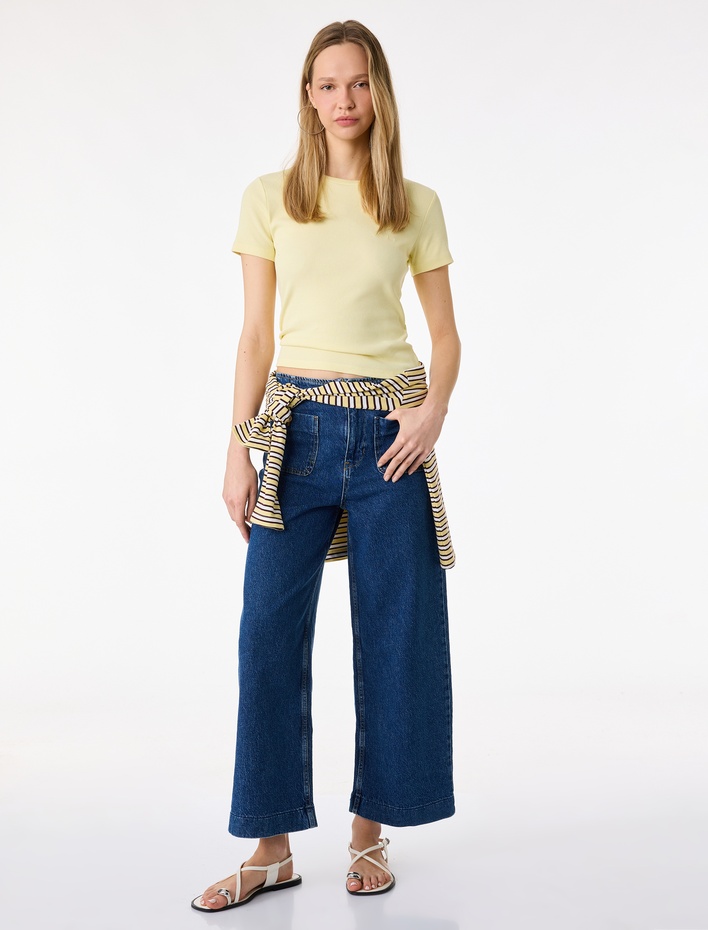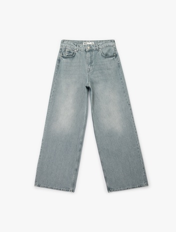 Düğme Detaylı Cepli Geniş Paça Denim Pantolon -  Wide Leg Jeans Sepete Ekle