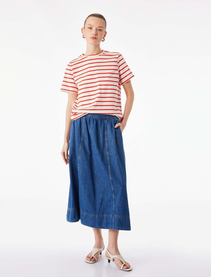 Rahat Kalıp Pamuklu Volanlı Midi Denim Etek Sepete Ekle