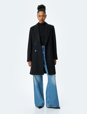 Kruvaze Düğmeli Cepli Uzun Oversize Kaban
