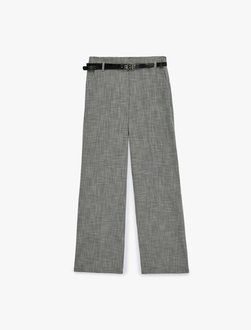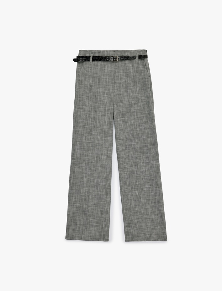 Aplike Cep Detaylı Geniş Paça Kemerli Kumaş Pantolon