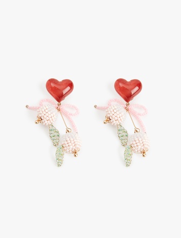 Büyük Boy Boncuklu Meyve Detaylı Fiyonklu Sallantılı Kalp Küpe Sepete Ekle