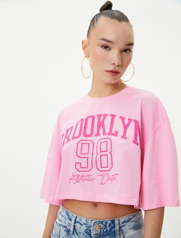 Baskılı Crop Tişört Rahat Kalıp Kısa Kollu Bisiklet Yaka Pamuklu
