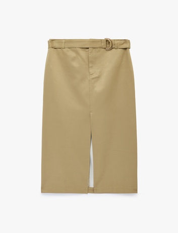 Kemerli Yüksek Bel Önden Yırtmaçlı Midi Kalem Etek