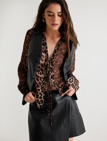 Leopar Desenli Bluz Önden Bağlamalı Uzun Kollu Gömlek Yaka Sepete Ekle