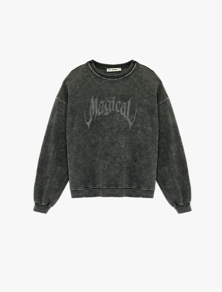 Yıkamalı Bisiklet Yaka Oversize Taşlı Sweatshirt Sepete Ekle