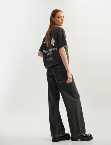 Arkası Baskılı Yıkamalı Bisiklet Yaka Kısa Kollu Oversize Tişört