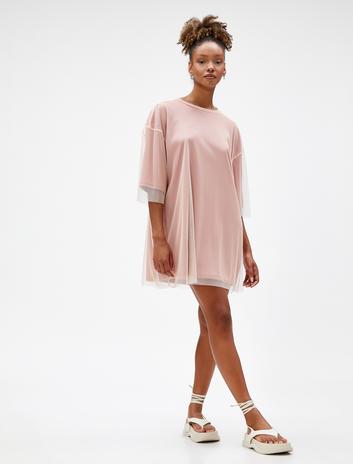 Oversize Tişört Uzun Transparan Tül Detaylı Kısa Kollu