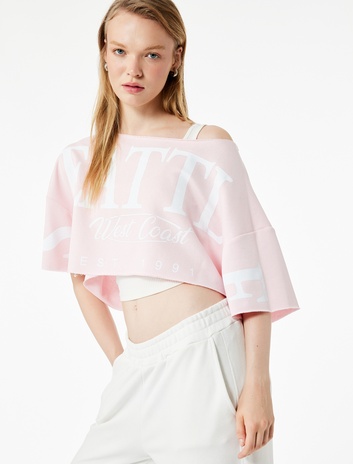 Kısa Kollu Omzu Açık Baskılı Oversize Crop Tişört