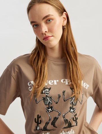 Kuru Kafa Baskılı Kısa Kollu Bisiklet Yaka Oversize Tişört