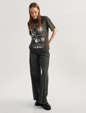 Kısa Kollu Bisiklet Yaka Baskılı Pamuklu Oversize Tişört