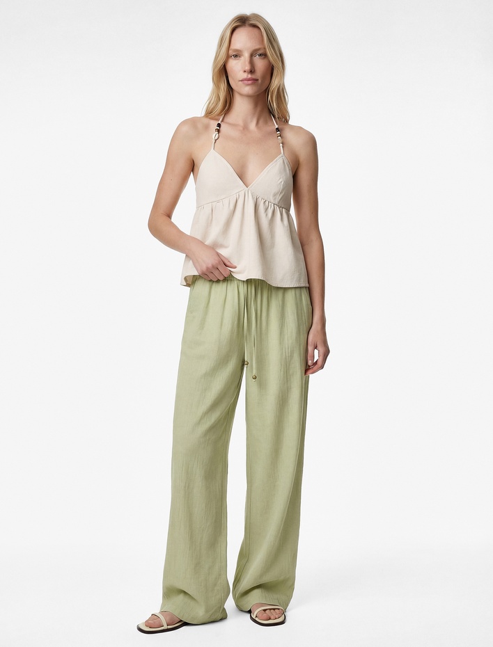 Keten Karışımlı Pantolon Beli Bağcıklı Cepli Havuç Kesim