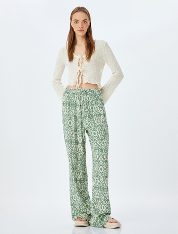 Beli Bağcıklı Desenli Viskon Geniş Paça Pantolon