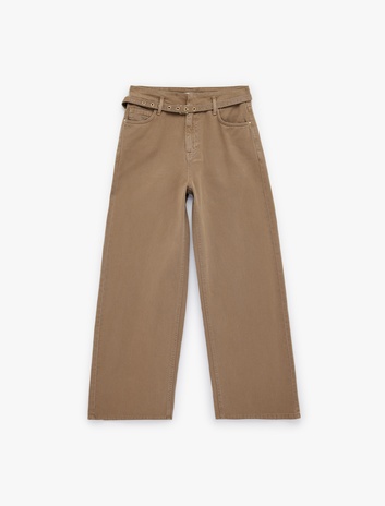 Pamuklu Yüksek Bel Kemerli Geniş Paça Pantolon - Wide Leg Jeans Sepete Ekle