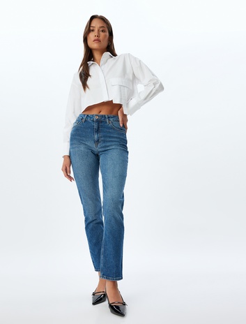 Mom Fit Kot Pantolon Standart Bel Kısa Paça Düğmeli Cepli Pamuklu - Mom Fit Jeans Sepete Ekle