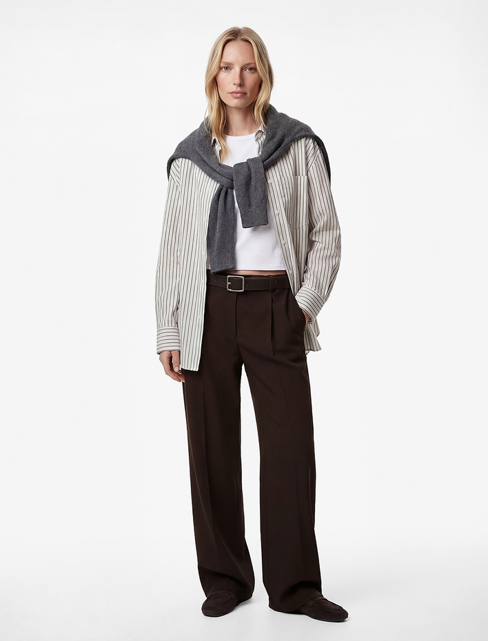 Pileli Cep Detaylı Düz Paça Kumaş Pantolon