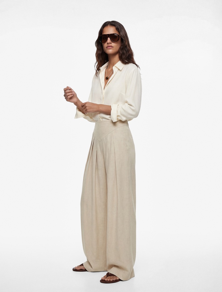 Yüksek Bel Geniş Paça Pileli Viskon Karışımlı Kumaş Pantolon