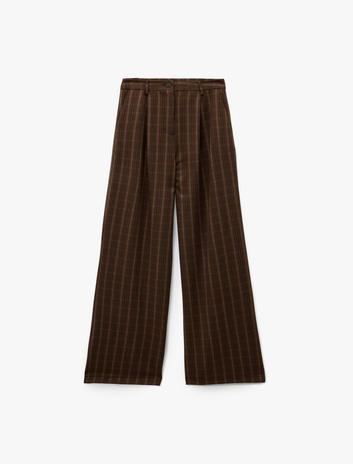 Viskon Karışımlı Cep Detaylı Düğmeli Geniş Paça Ekoseli Pantolon