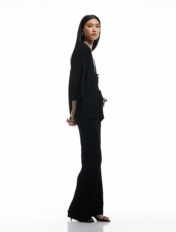 Beli Bağlamalı Dokulu Bol Düz Paça Pantolon