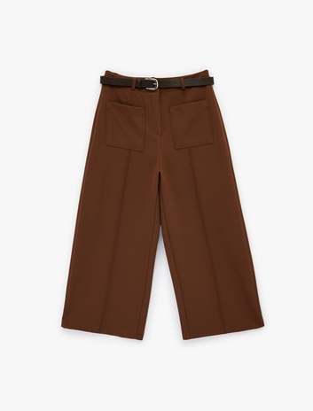 Aplike Cep Detaylı Geniş Paça Kemerli Kumaş Pantolon Sepete Ekle