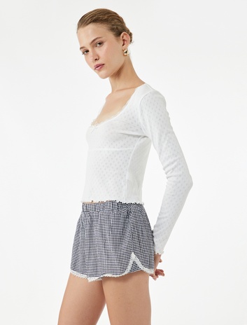Pamuklu Rahat Kalıp Düğmeli Paçası Dantelli Beli Lastikli Pötikareli Şort Pijama Altı