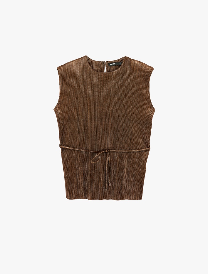 Kemerli Bisiklet Yaka Vatkalı Kolsuz Saten Piliseli Bluz Sepete Ekle