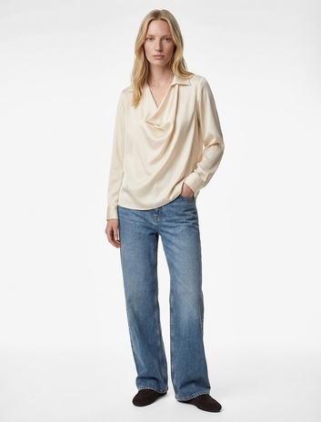 Dökümlü Gömlek Yaka Uzun Kollu Saten Bluz Sepete Ekle