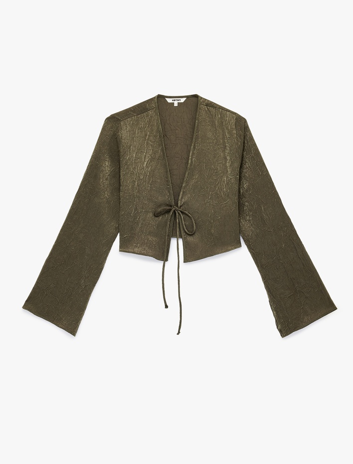 Uzun Kollu Önden Bağlama Detaylı Dokulu Crop Saten Bluz Sepete Ekle