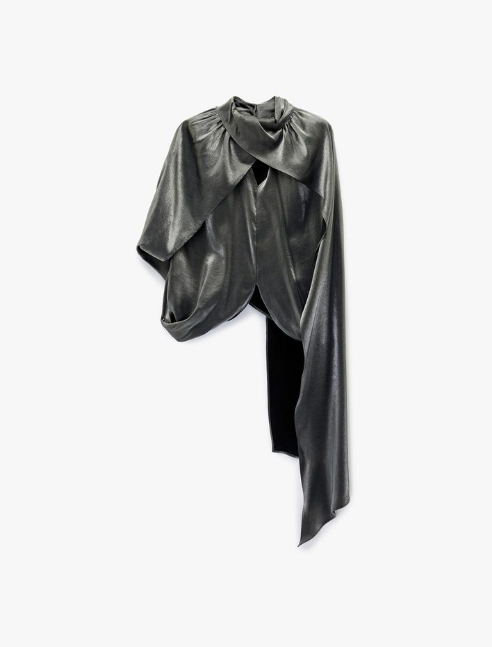 Asimetrik Kesim Kolsuz Dik Yaka Saten Pelerin Bluz Sepete Ekle