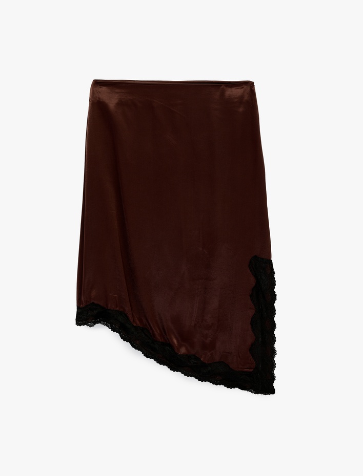Asimetrik Slim Fit Dantel Detaylı Saten Midi Etek Sepete Ekle