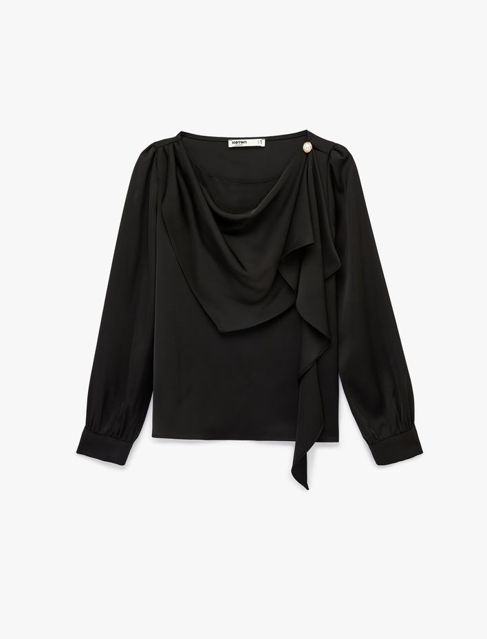 Dökümlü Şal Yaka Metal Aksesuarlı İnci Detaylı Uzun Kollu Saten Bluz Sepete Ekle