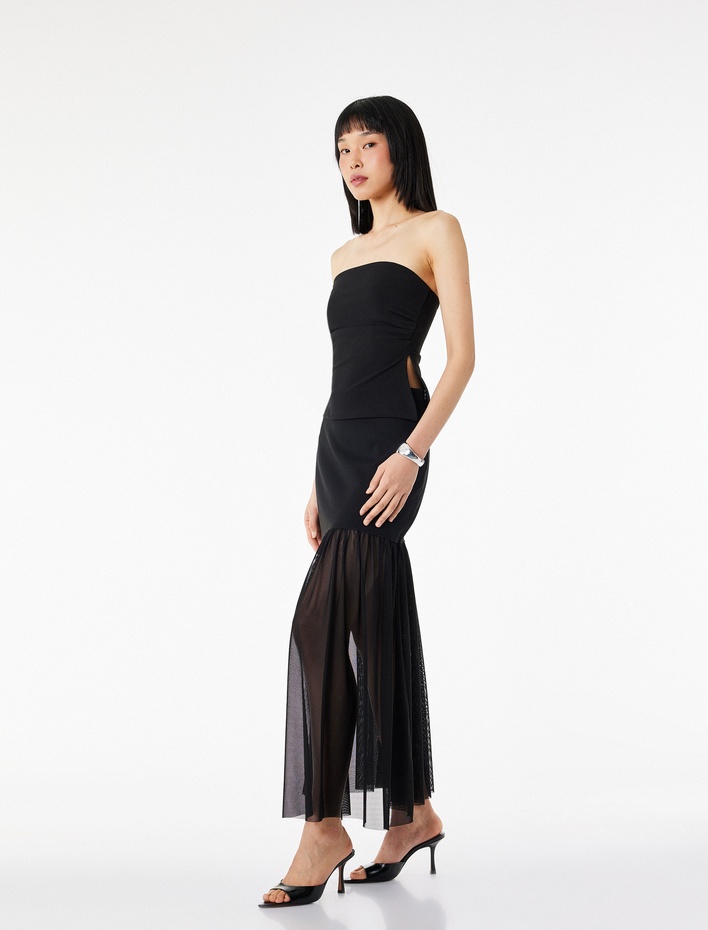 Krep Scuba Kumaş Slim Fit Transparan Tül Detaylı Midi Etek Sepete Ekle