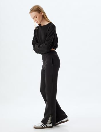 Bol Paça Eşofman Altı Beli Lastikli Yırtmaç Detaylı Yüksek Bel Şardonlu Cepli