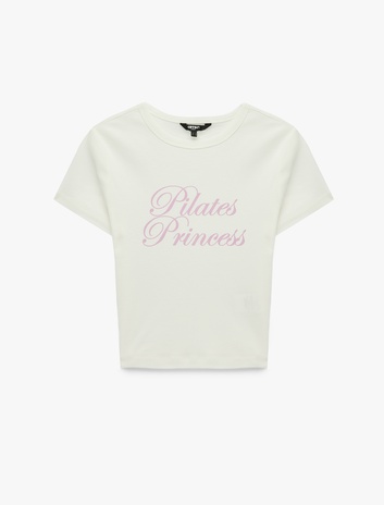 Slim Fit Kısa Kollu Bisiklet Yaka Baskılı Crop Spor Tişört