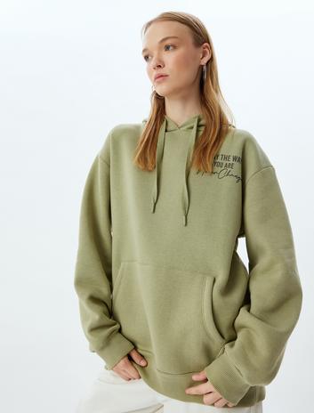Şardonlu Oversize Kapüşonlu Sweatshirt Slogan Baskılı Uzun Kollu Sepete Ekle
