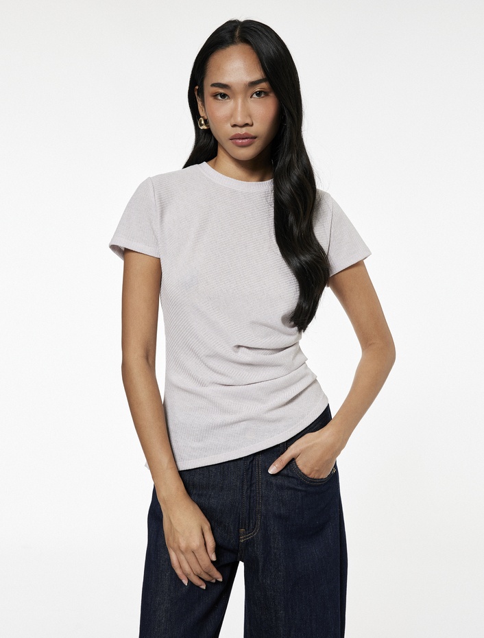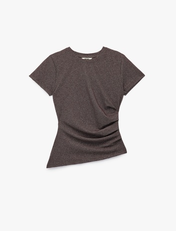 Drape Detaylı Kısa Kollu Bisiklet Yaka Asimetrik Kesim Simli Tişört Sepete Ekle