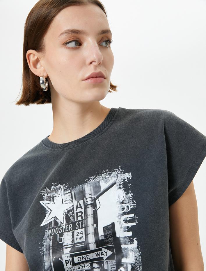 Kolsuz Crop Tişört Degrade Metalik Varak Baskılı Slim Fit Pamuklu Sepete Ekle