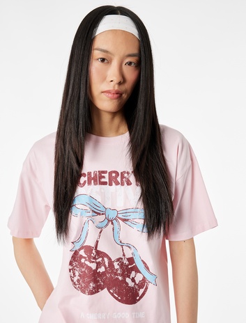 Kiraz Baskılı Kısa Kollu Bisiklet Yaka Pamuklu Pullu Payetli Tişört Sepete Ekle