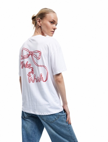 Bisiklet Yaka Kısa Kollu Pamuklu Arkası Fiyonk Baskılı Oversize Tişört