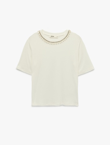 Regular Fit Kısa Kollu İnci Detaylı Bisiklet Yaka Viskon Tişört Sepete Ekle