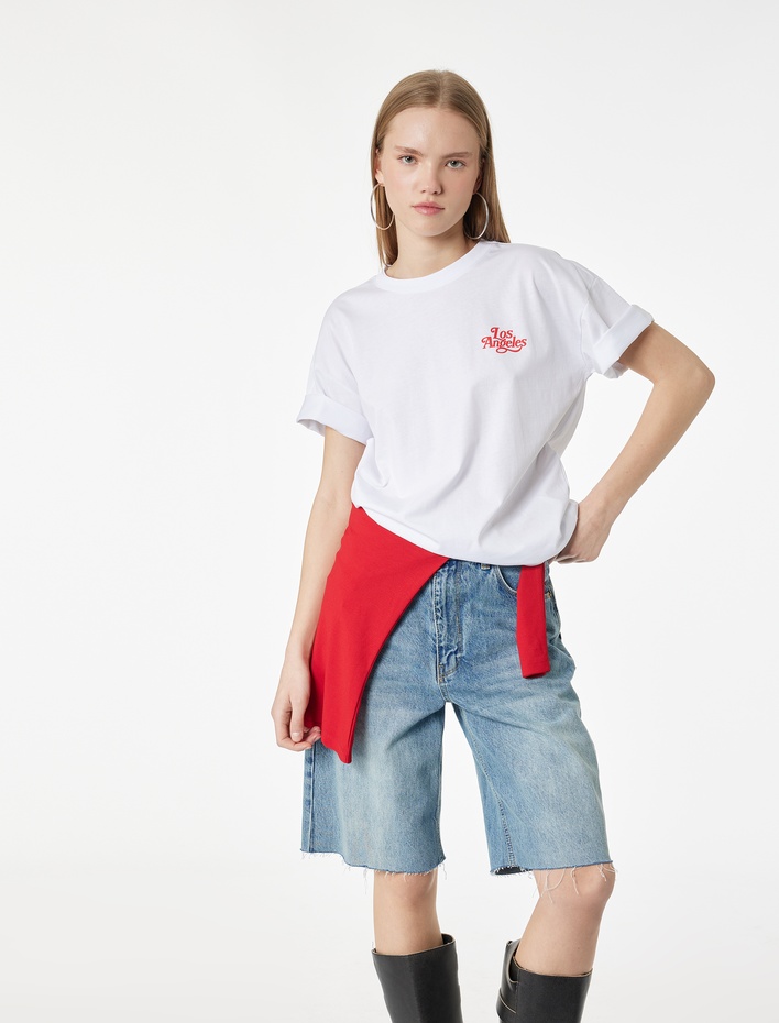Kısa Kollu Bisiklet Yaka Nakışlı Oversize Tişört Sepete Ekle