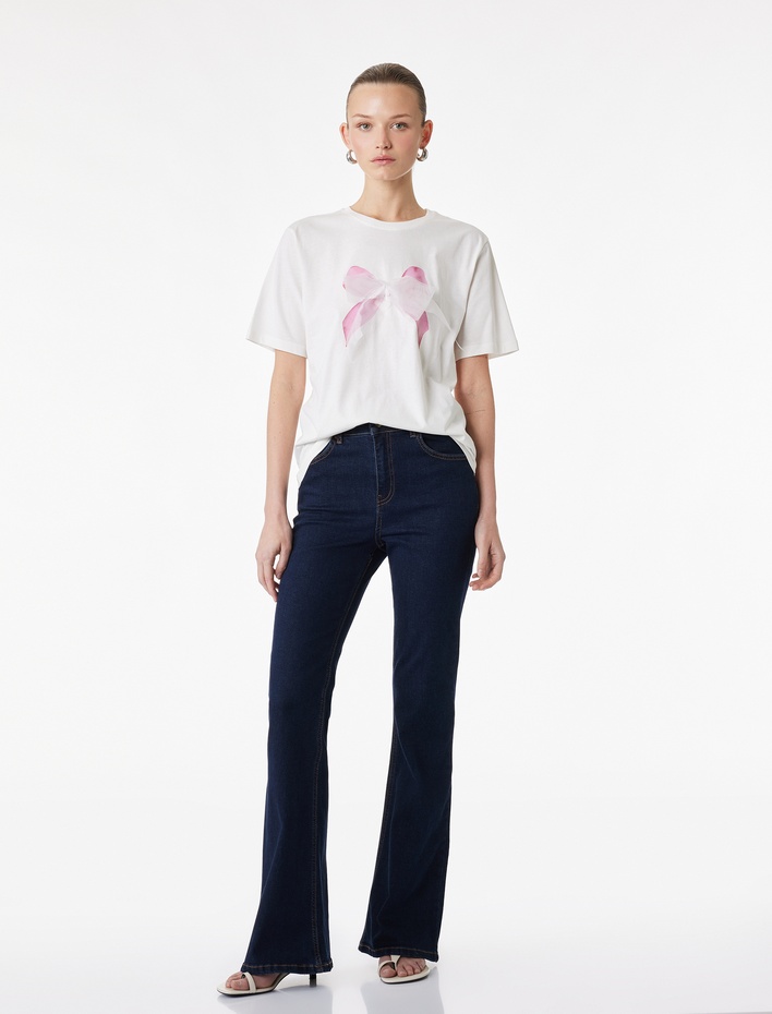 Pamuklu Kısa Kollu Bisiklet Yaka Fiyonk Aplike Detaylı Tişört Sepete Ekle