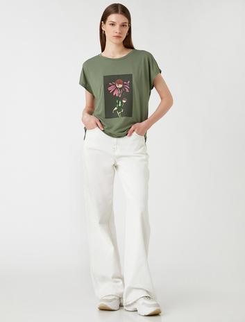 Çiçek Baskılı Tişört Kısa Kollu Bisiklet Yaka Sepete Ekle