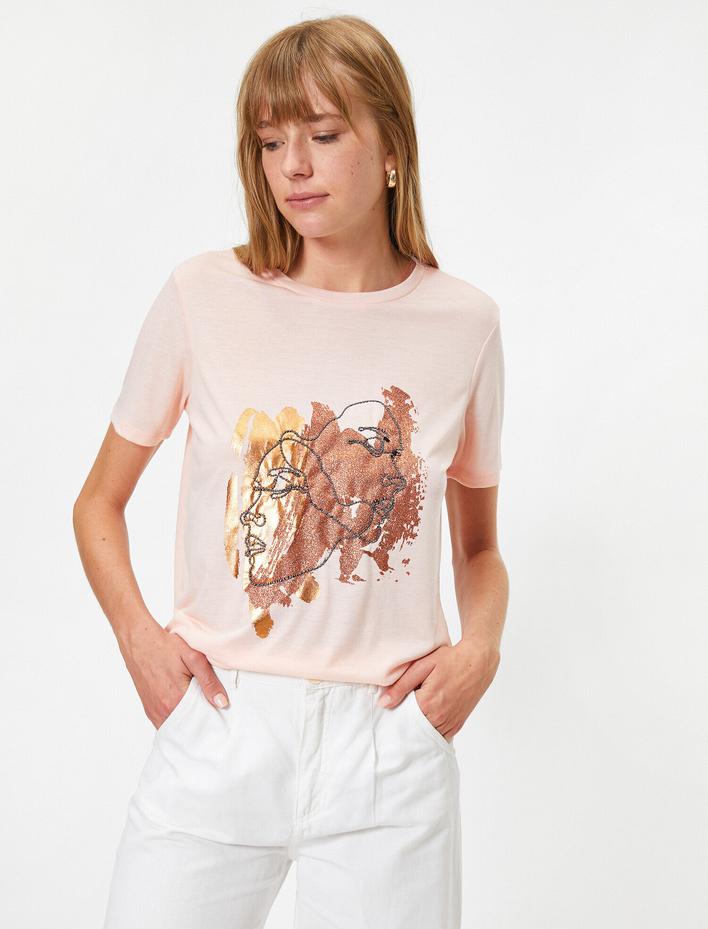 Parlak Baskılı Bisiklet Yaka Kısa Kollu Tişört Sepete Ekle