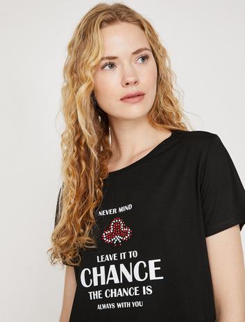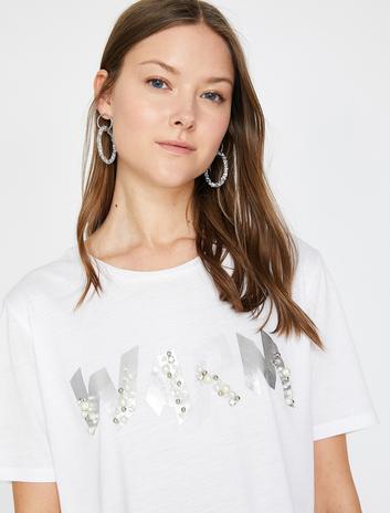 Taş Detaylı Yazı Baskılı Bisiklet Yaka Tişört Sepete Ekle